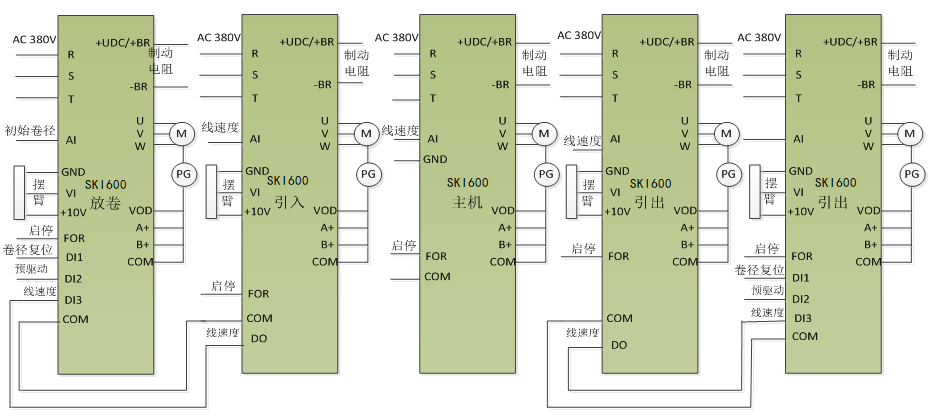 PLC只完成簡單的不同版輥同步頻率的匹配(主速度處理),邏輯控制、大量的張力控制和運(yùn)算由變頻器內(nèi)部自動完成;安裝、調(diào)試簡單易行;